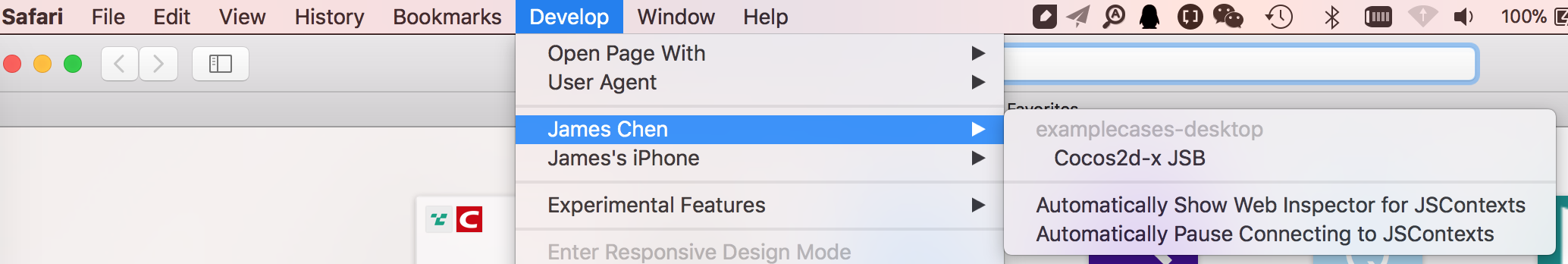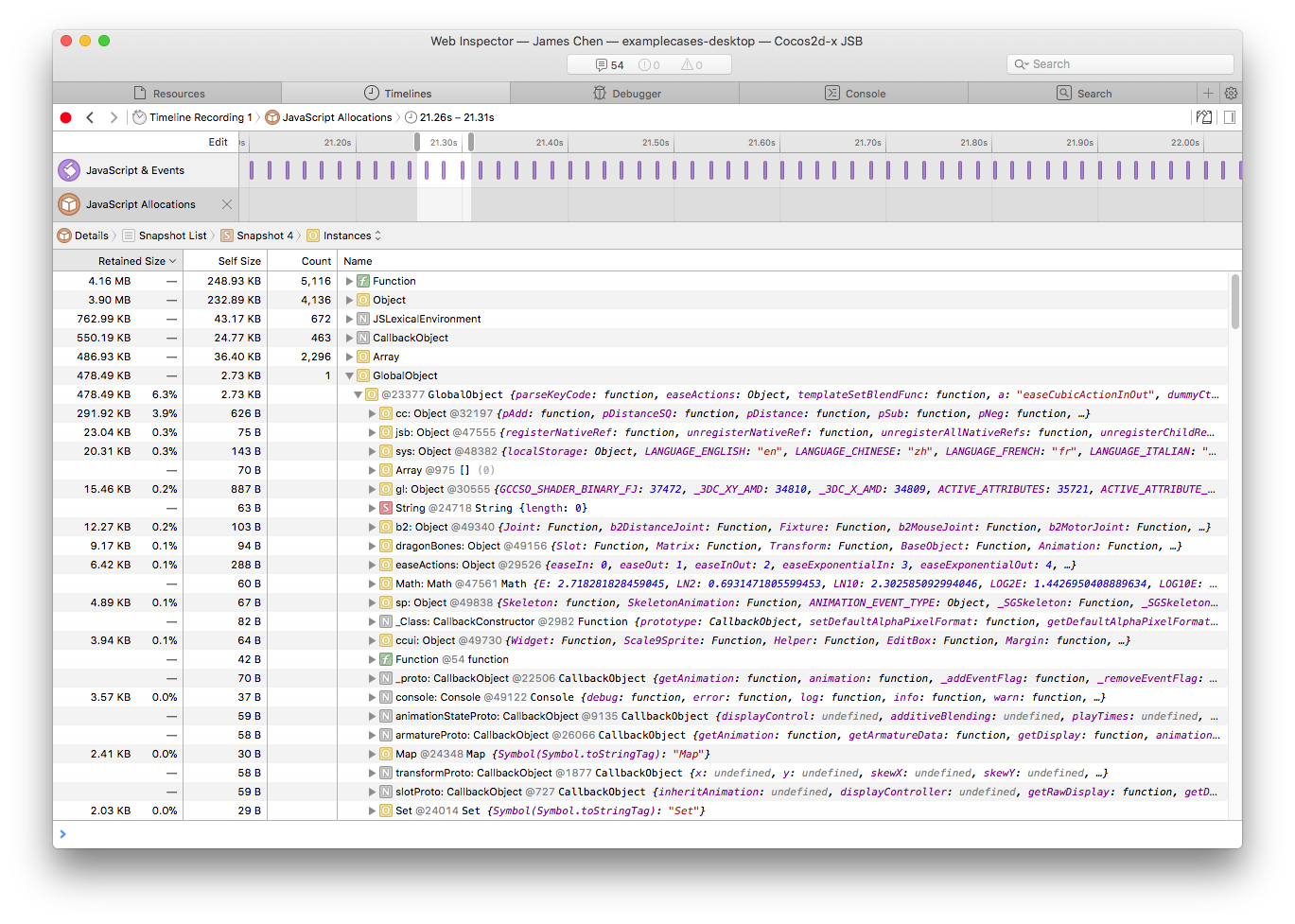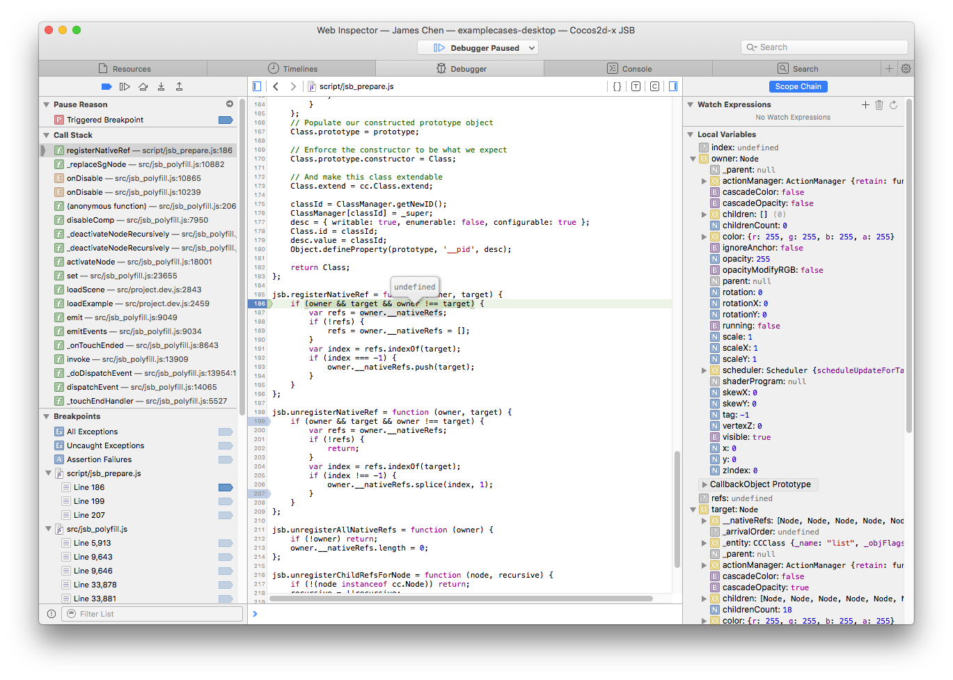 - Safari菜单中选择Develop -> 你的Mac设备名称 -> Cocos2d-x JSB 会自动打开Web Inspector页面,然后即可进行设置断点、Timeline profile、console等操作。