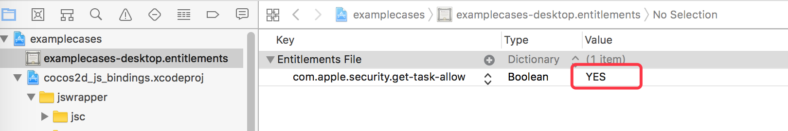 - 打开entitlements文件,添加com.apple.security.get-task-allow,值类型为Boolean,值为true.