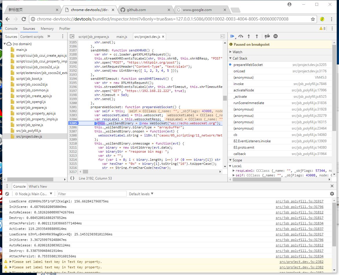 - 用Chrome浏览器打开chrome-devtools://devtools/bundled/inspector.html?v8only=true&ws=127.0.0.1:5086/00010002-0003-4004-8005-000600070008