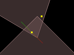 The lines shown in the figure is the normal vectors on the contact point. In this collision, the quickest way to solve the collision is to add the impulse to push the triangle to the top and push the box down to the right. It should be noted that the normal vector here is only about the direction, not with the location properties, nor with connection to any of these contact points.